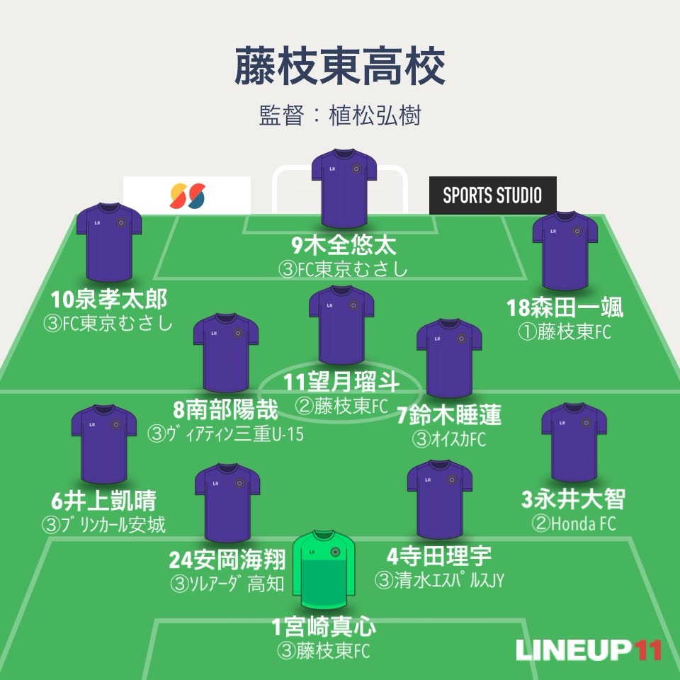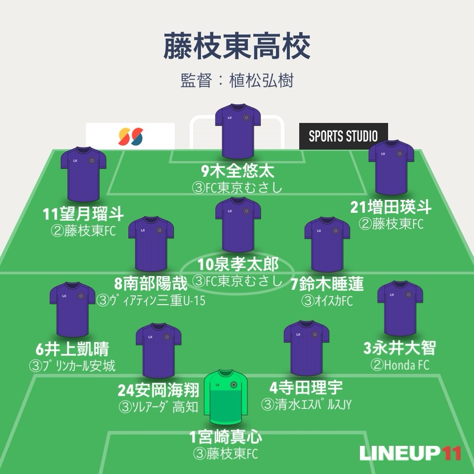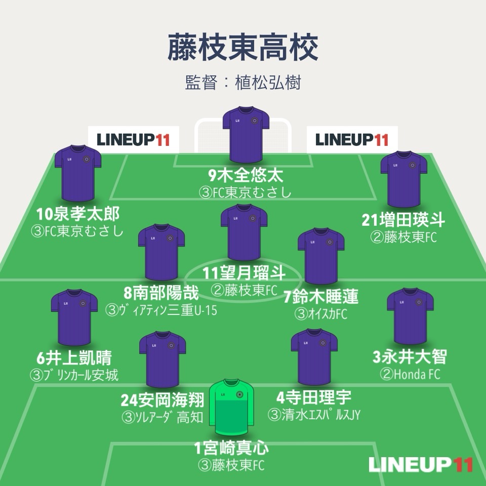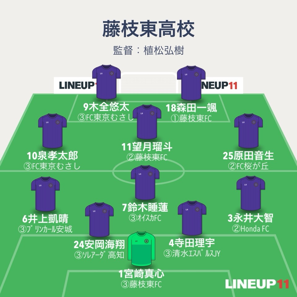 藤枝東は4-2-3-1。GK宮崎真心、DFは永井大智、寺田理宇、安岡海翔、井上凱晴。ボランチは鈴木睡蓮と南部陽哉で、2列目は増田瑛斗、泉孝太郎、望月瑠斗。FWは木全悠太。