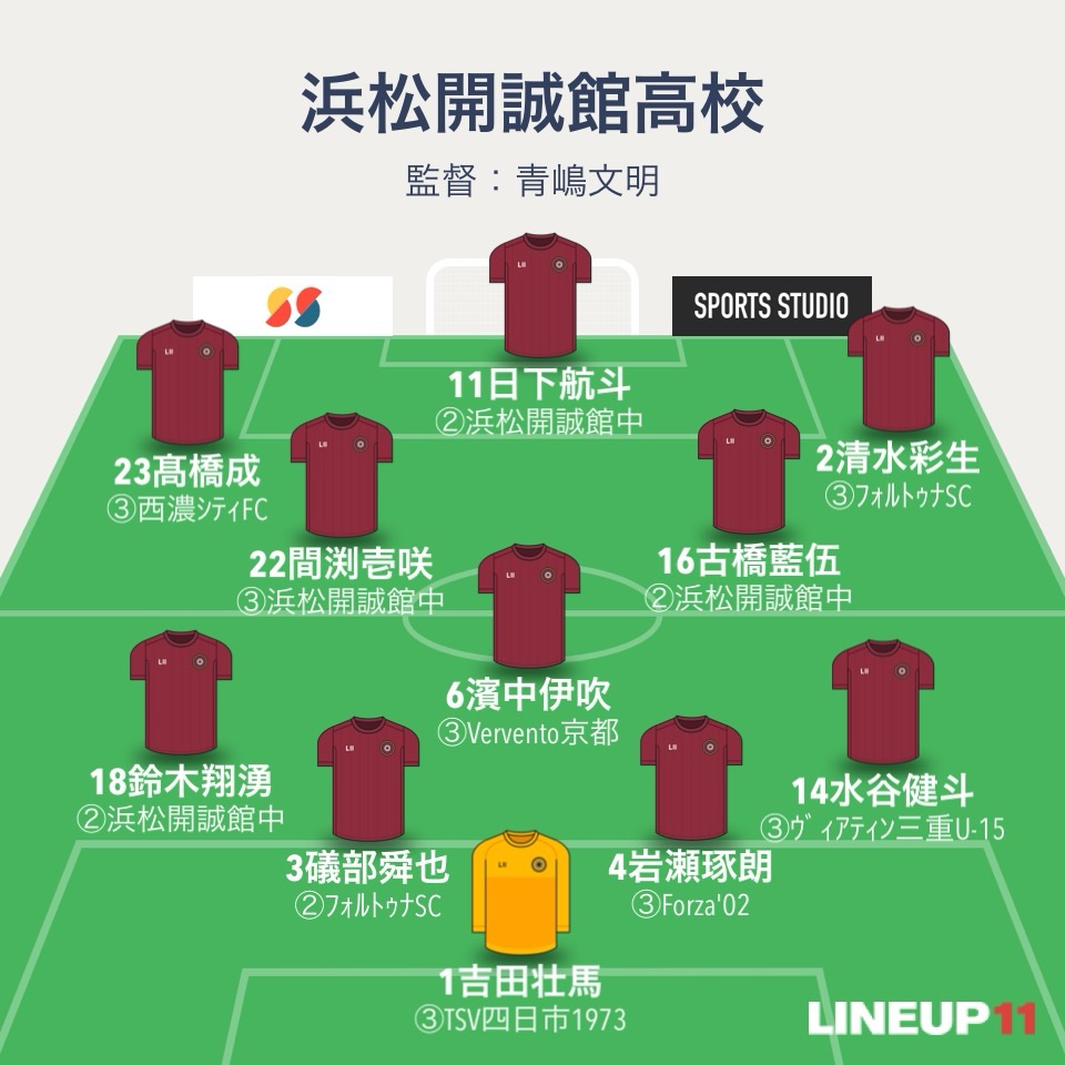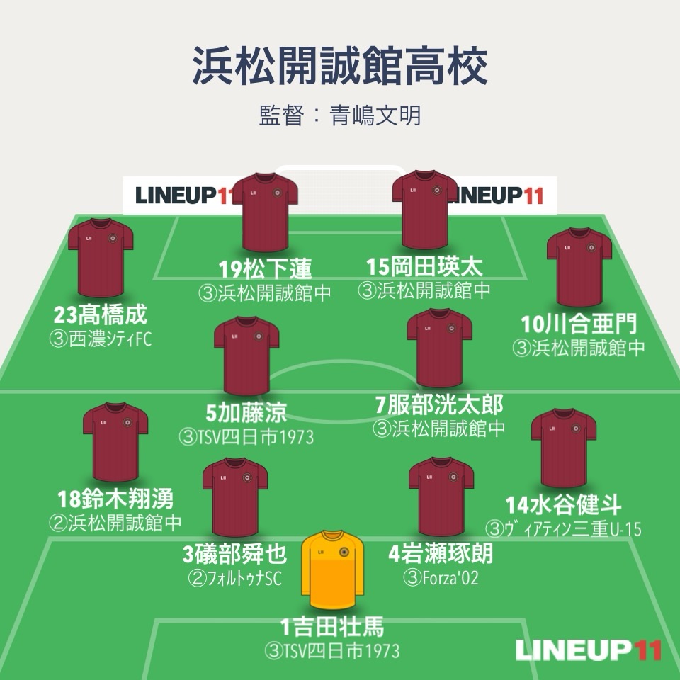 浜松開誠館は、昨年の選手権でレギュラーだったMF友田龍成やU-16静岡県選抜歴のあるFW米村修人や全中優勝世代のストライカーでプレシーズンはウイングバックとして出場機会を掴んでいたDF田窪悠己、昨年U-15日本代表候補入りしたMF大石櫂などがメンバー外。また、MF大柴温大とDF濱中伊吹がスタメンから外れました。開誠館は本当にメンバーが読めないです。