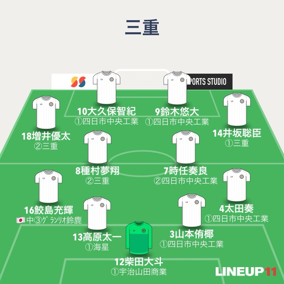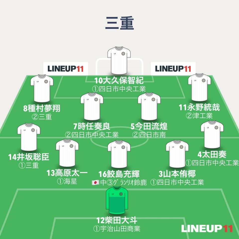 三重県選抜は5-4-1。GKは柴田大斗、5バックは右からDF太田奏、DF山本侑椰、DF鮫島充輝、DF高原太一、DF井坂聡臣。中盤4枚は右からMF永野統哉、MF今田流煌、MF時任奏良、MF種村夢翔。ワントップはFW大久保智紀。