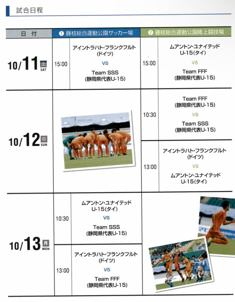 参加チームは静岡県選抜のTeam FFFとTeam SSS、ドイツのアイントラハト・フランクフルト、タイのムアントン・ユナイテッドの4チームです。