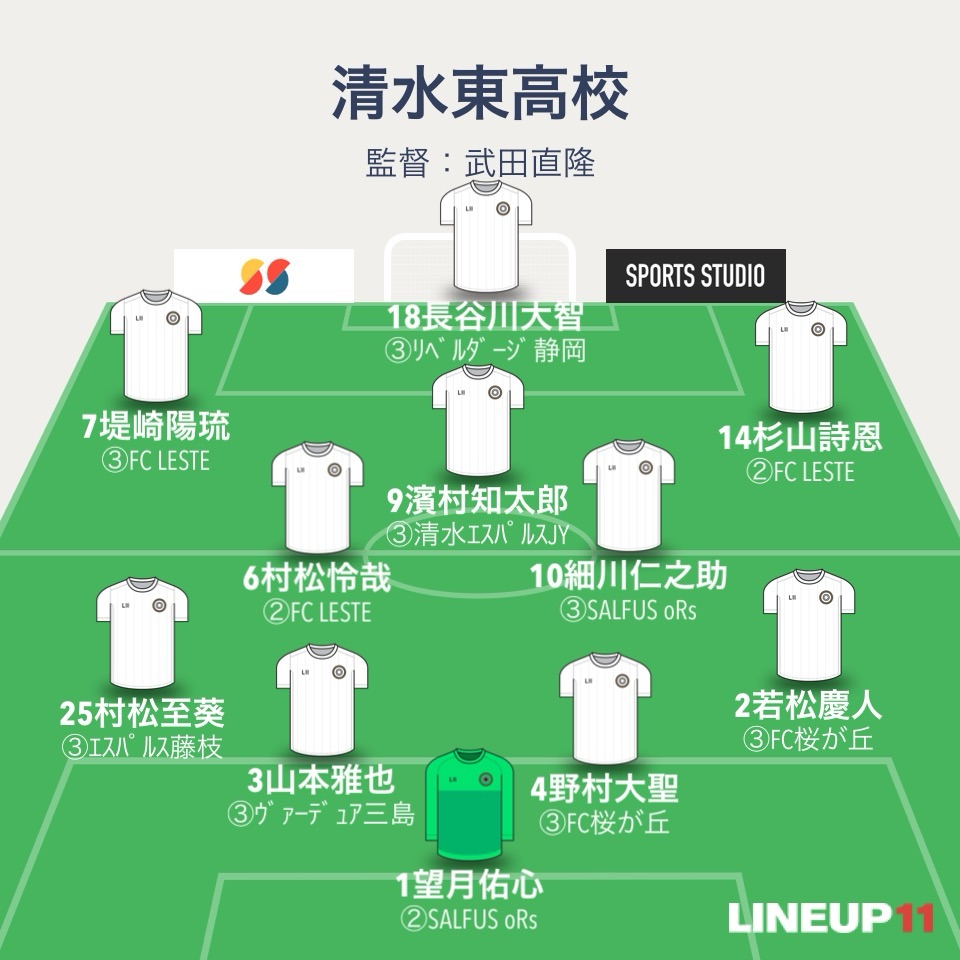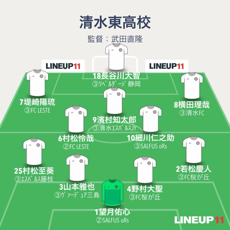 清水東は4-2-3-1。GKは望月佑心。4バックは若松慶人、野村大聖、山本雅也、村松至葵。ボランチは村松怜哉と細川仁之助。2列目は横田理哉、濱村知太郎、堤崎陽琉。センターフォワードは長谷川大智。エースFW白川翔はベンチスタート。