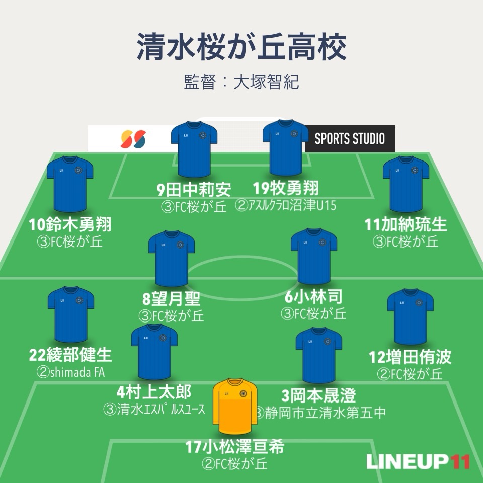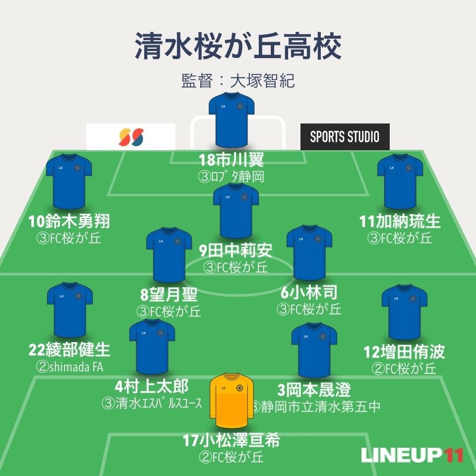 清水桜が丘は4-4-2。GKは2年生の小松澤亘希。4バックはDF増田侑波、岡本晟澄、村上太郎、綾部健生。ボランチは小林司と望月聖、右SHに加納琉生で左SHに10番鈴木勇翔。2トップが田中莉安と牧勇翔。