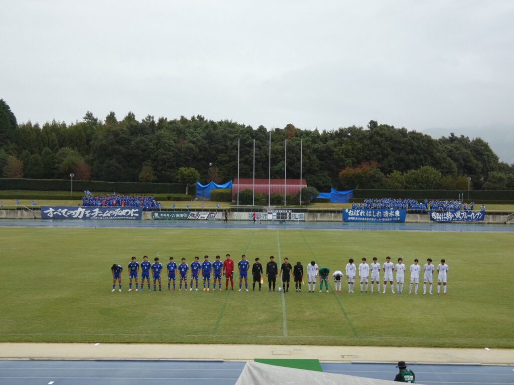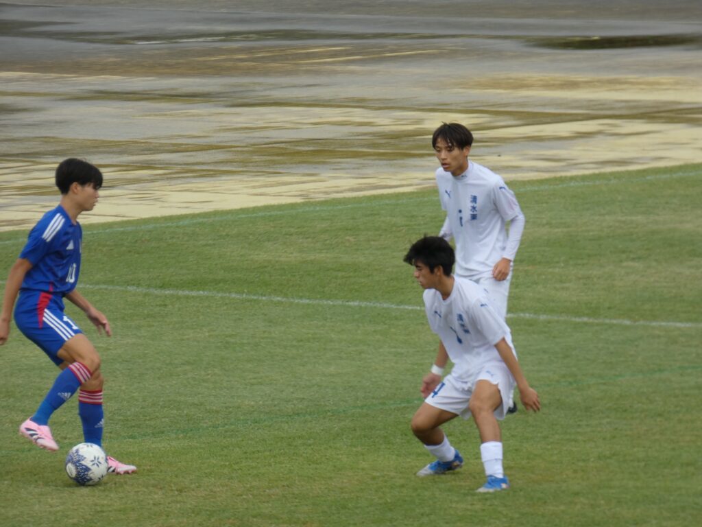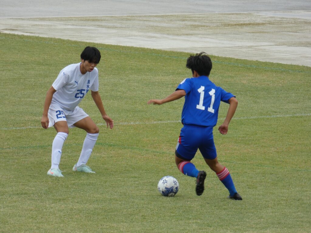 前半は互いに持ち味を出して攻め合うものの、無得点。清水桜が丘は長いボールを使いつつ両サイドの10番MF鈴木勇翔とMF加納琉生から攻める戦い方。