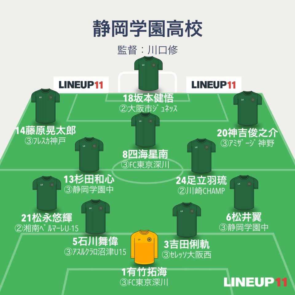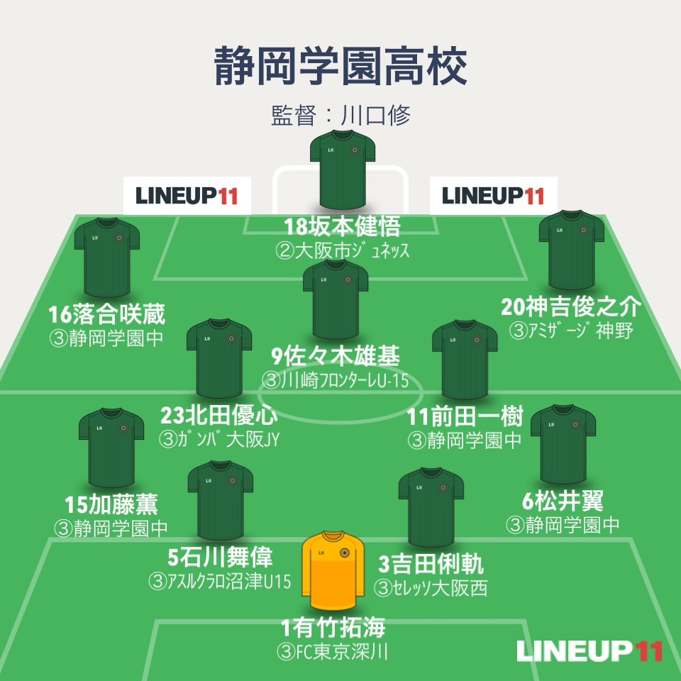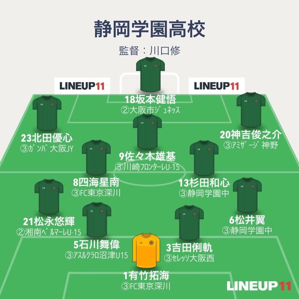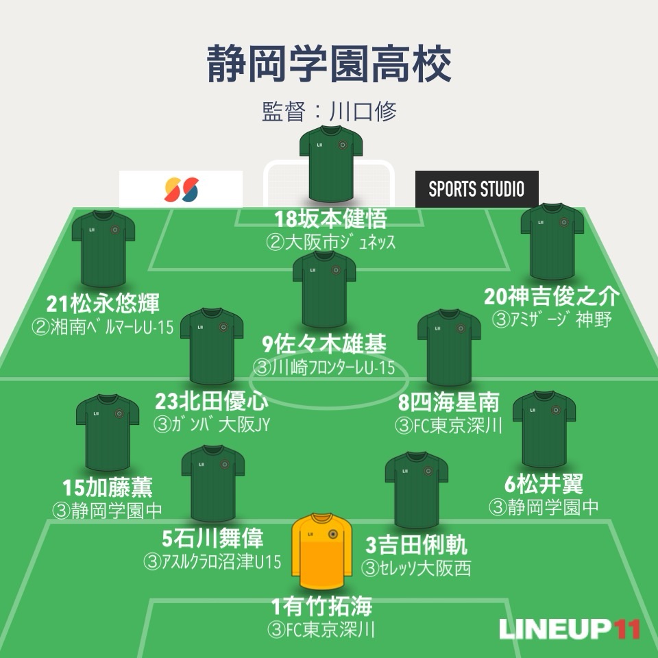 静学のフォーメーションは4-2-3-1。GK有竹拓海、4バックはDF松井翼、DF吉田俐軌、DF石川舞偉、DF松永悠輝。ボランチはMF杉田和心とMF足立羽琉。2列目はMF神吉俊之介、MF四海星南、MF藤原晃太郎。ワントップはFW坂本健悟。2年生トリオが全員スタメン。