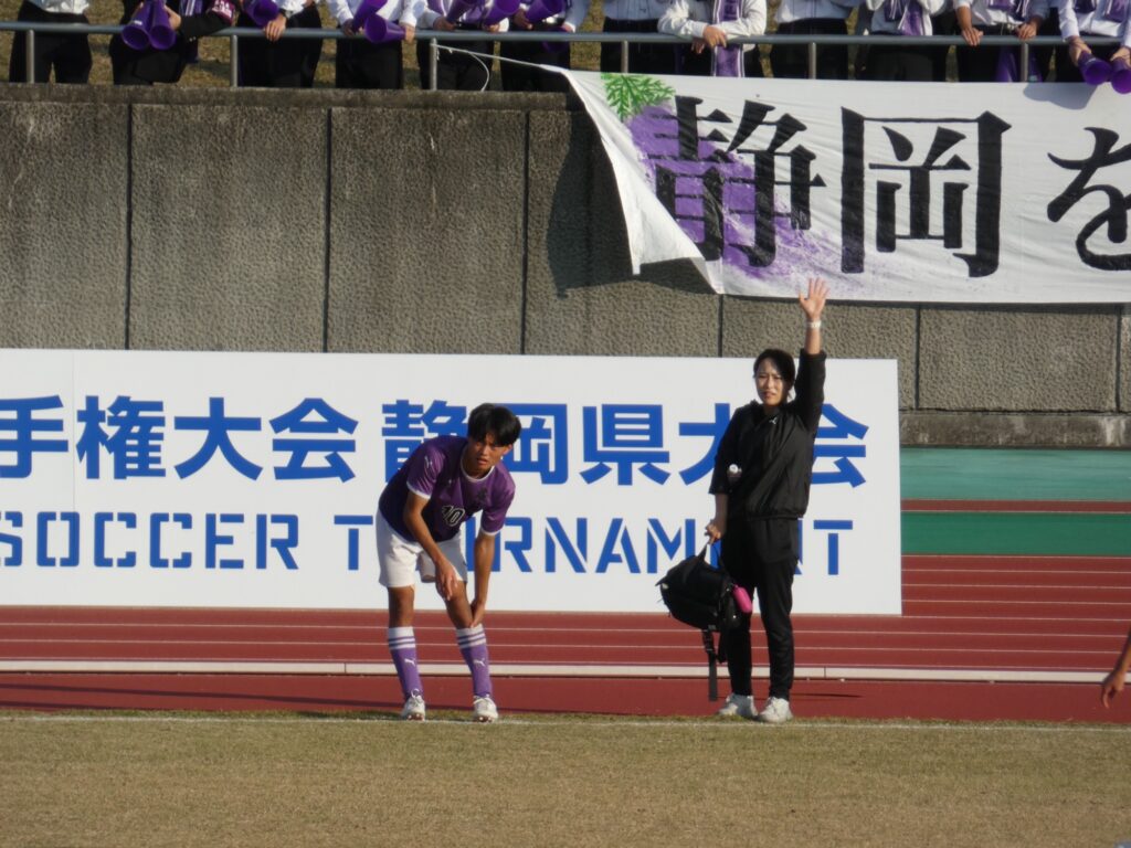後半37分、藤枝東ゴール前で静学がフリーキックを獲得したタイミングで、藤枝東はMF南部陽哉に代えて2年生MF原田音生を投入。