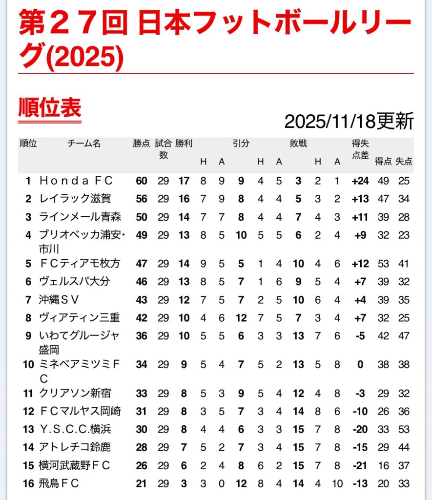個人的にはJFLに落ちても試合は見に行くと思うので、JFL降格それ自体にはそんなに恐れてはいません。たまにはいつもと違うチームとの試合を見たいなというだけの理由ですが。しかし、往々にしてあるのは降格による資金減、資金減に伴う主力大量放出と成績悪化、JFL定着です。昨季J3からJFLに降格したいわてグルージャ盛岡とYSCC横浜は1年でのJ3復帰ならず。J2を経験した岩手ですら9位であり、既に主力の大量放出をリリースしています。清水エスパルスのように降格したのにスポンサーが増えるチームは稀です。