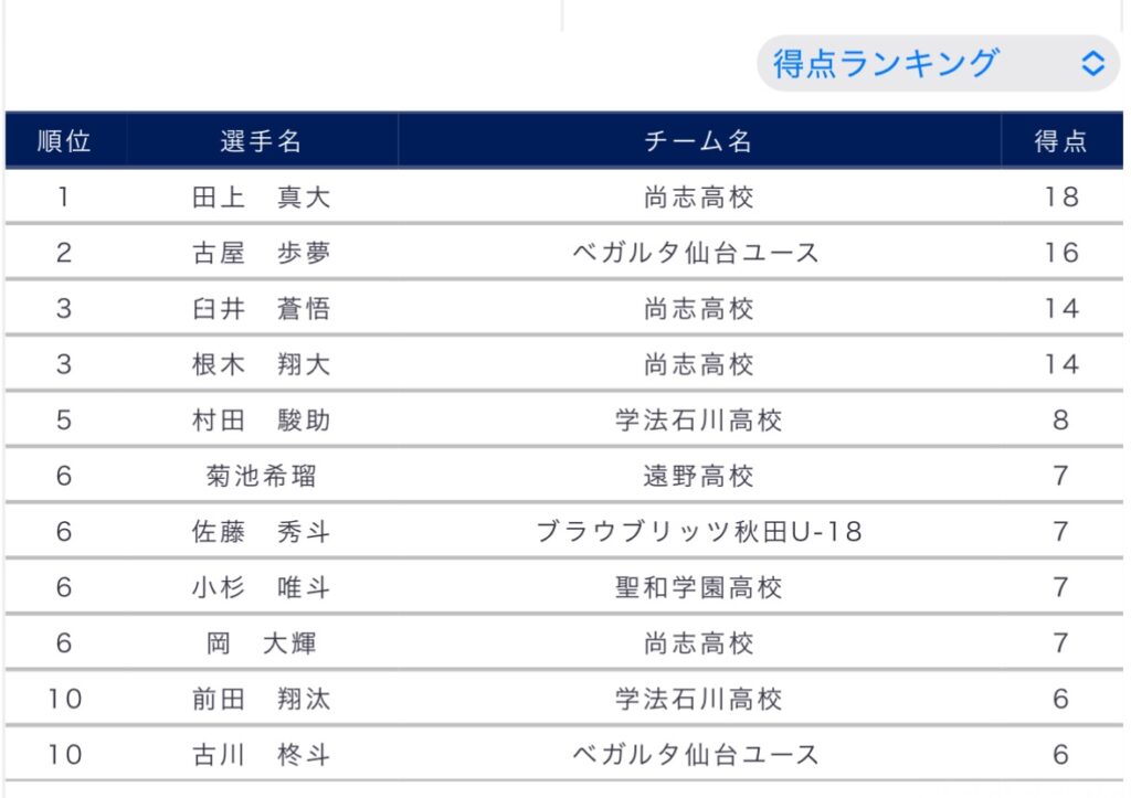プリンス東北は得点ランキング1位が尚志の10番田上真大の18得点で、2位が仙台ユースのFW古屋歩夢の16得点。さらに3位は尚志の臼井蒼悟と根本翔大で14得点。