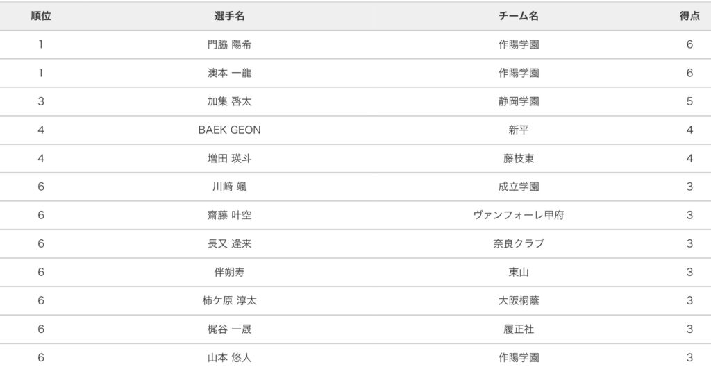 大会通算の得点ランキングです。1位はなんと作陽学園から2人。6得点で1年生FW門脇陽希とFW澳本一龍が同率で得点王になりました。3位は静岡学園のMF加集啓太。藤枝東のチーム内得点王は4得点でFW増田瑛斗。