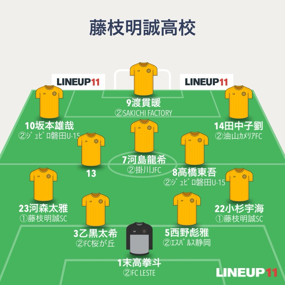 明誠は4-2-3-1。GKは末高拳斗、4バックはDF小杉宇海、DF西野彪雅、DF乙黒太希、DF河森太雅。ダブルボランチは13番とMF高橋東吾でトップ下は河島龍希。右WGはMF田中子劉で左WGがMF坂本雄哉、真ん中にFW渡貫暖。
