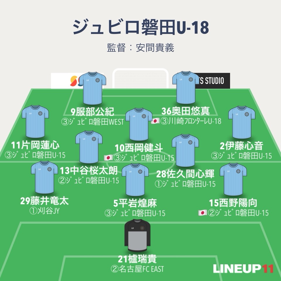 磐田U-18のフォーメーションは3-4-1-2。GK櫨瑞貴、3バックはDF西野陽向、DF平岩煌麻、DF藤井竜太。ボランチはMF佐久間心輝とMF中谷桜太朗、右WGがDF伊藤心音で左WBがMF片岡蓮心。トップ下にMF西岡健斗、2トップはFW服部公紀とMF奥田悠真。MF佐久間心輝と刈谷JYから加入したDF藤井竜太が1年生ながらスタメン入り。