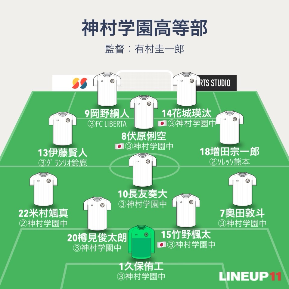 神村学園はダイヤモンド型の4-4-2。GK久保侑工、4バックはDF奥田敦斗、DF竹野楓太、樽見俊太朗、DF米村颯真。アンカーにMF長友奏大、右SH増田宗一郎、左SH伊藤賢人、トップ下伏原俐空。2トップはFW岡野綱人とFW花城瑛汰。