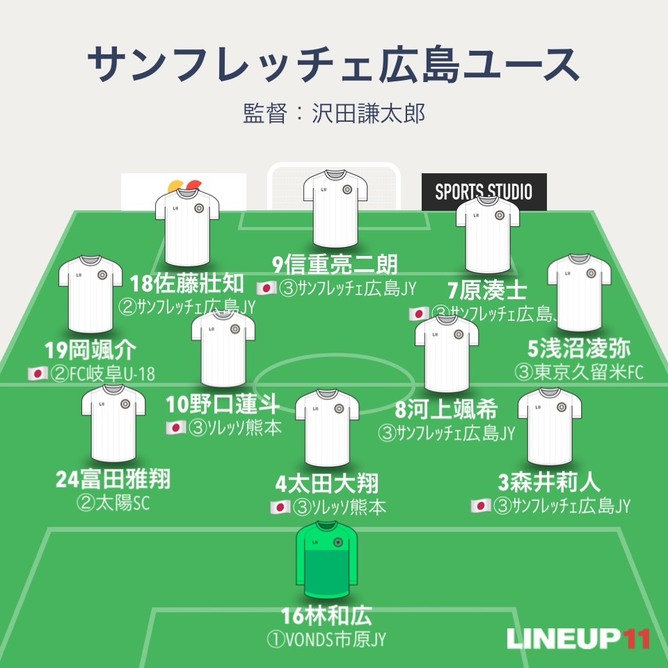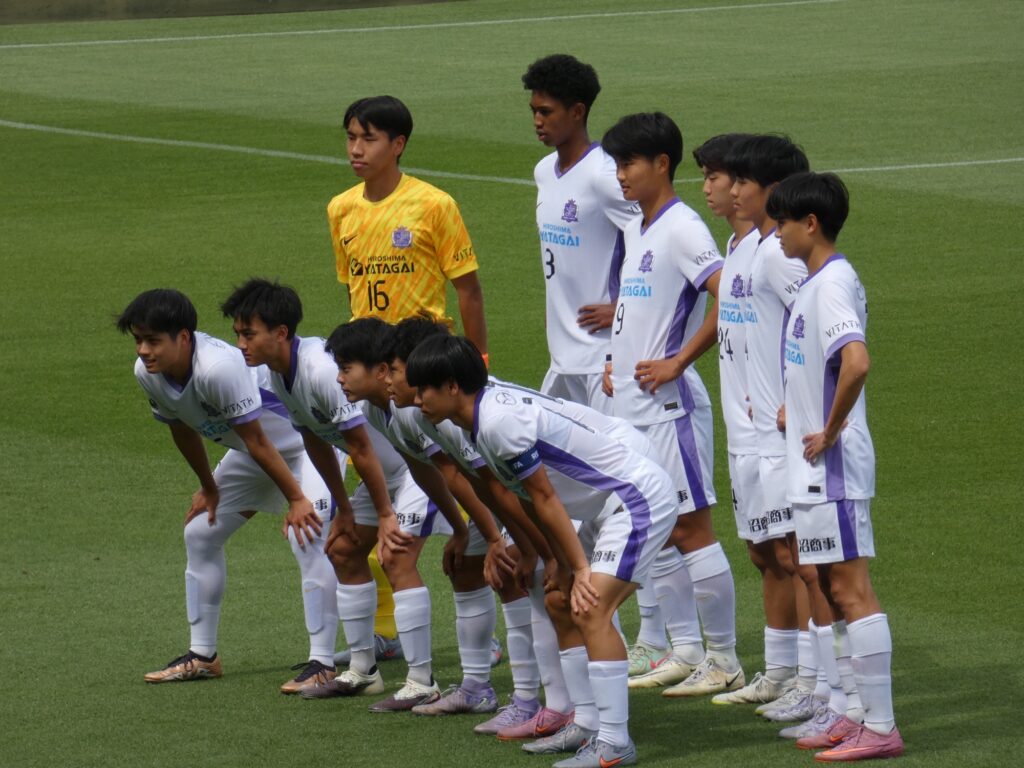 サンフレッチェ広島ユースも3-4-2-1。GKは188センチの1年生GK林和広。3バックは195センチのU-17日本代表DF森井莉人、181センチDF太田大翔、180センチDF富田雅翔。ダブルボランチは昨年U-17W杯に出場した10番MF野口蓮斗とMF河上颯希、右WBがDF浅沼凌弥で左WBがMF岡颯介。シャドーがMF原湊士とFW佐藤壯知、ワントップがFW信重亮二朗。