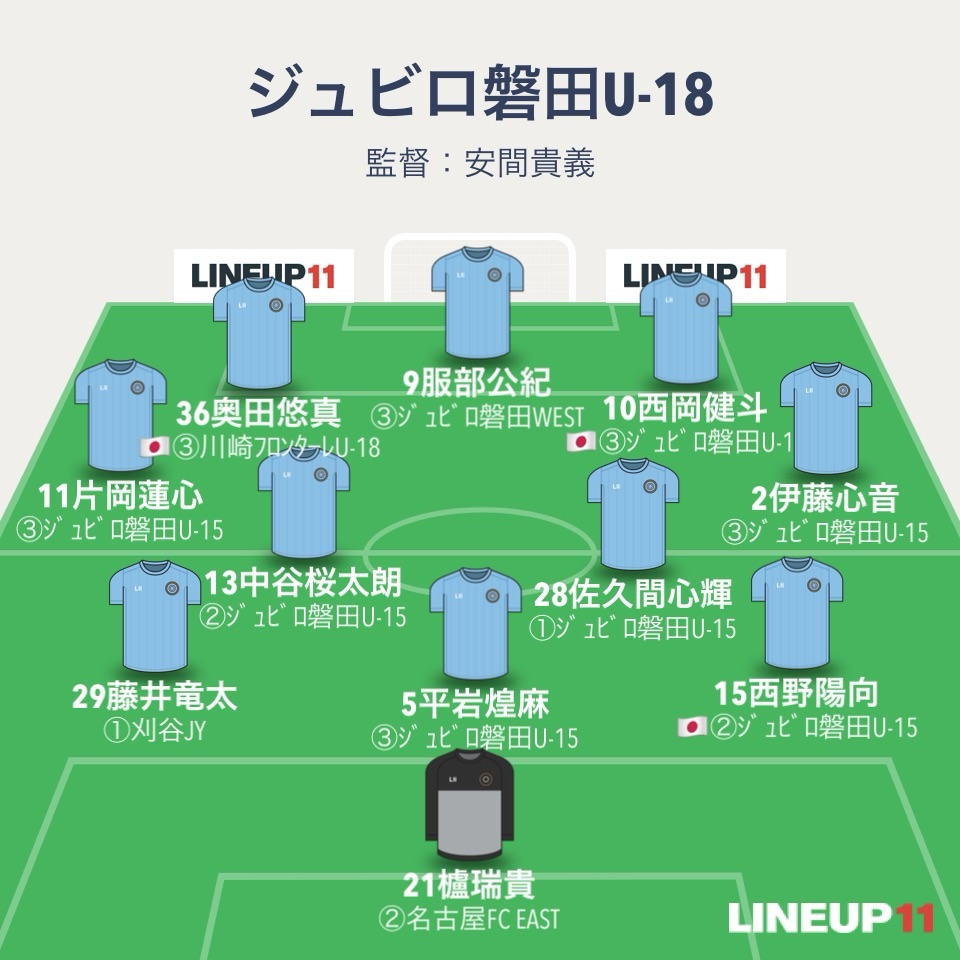 磐田U-18のスタメンは3-4-2-1。神村学園戦とメンバーは同じ。GK櫨瑞貴、3バックはDF西野陽向、DF平岩煌麻、DF藤井竜太。ダブルボランチがMF中谷桜太朗とMF佐久間心輝、右WBがDF伊藤心音、左WBがMF片岡蓮心。前線はMF西岡健斗とMF奥田悠真の2シャドーでワントップに服部公紀。神村戦では前3枚の関係をトップ下+2トップの関係で表記しましたが、今節は服部のワントップに奥田と西岡の2シャドーと表記しました。