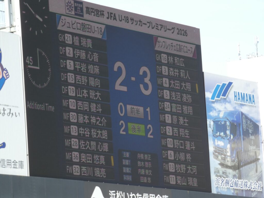 前半は磐田U-18のゲームと言っても差し支えない内容でしたが、ほんの一瞬の隙をつかれて1点ビハインドで折り返し。後半も61分と69分に連続失点して一時は0-3まで引き離されるも、MF奥田悠真とMF西岡健斗のダブルエースが決めて1点差に。この1点を返すまでには至らず惜敗。プレミア未勝利対決で痛恨の敗戦を喫し、プレミア開幕4戦未勝利となりました。